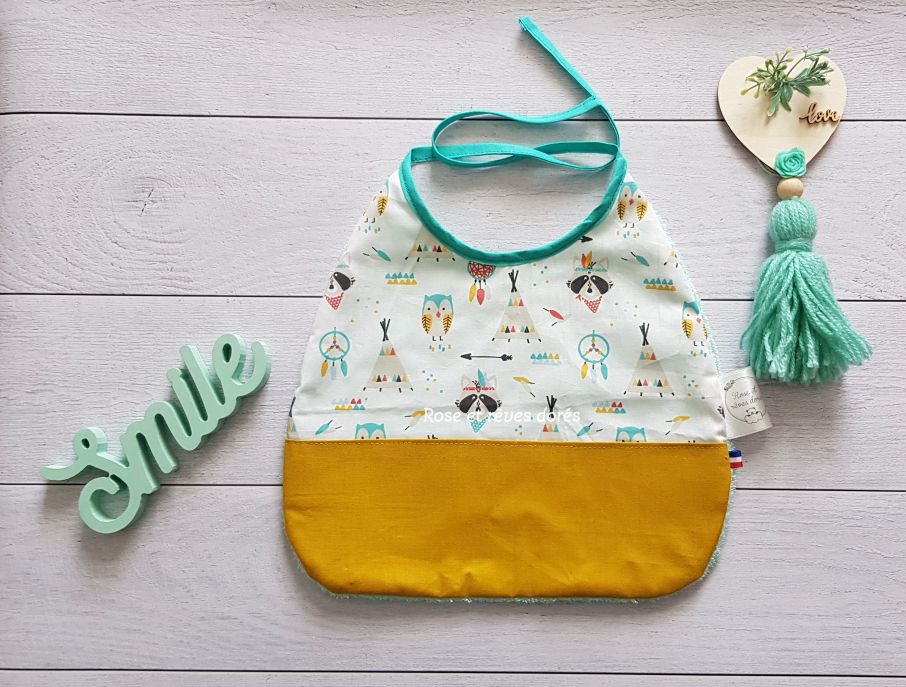 En choisissant un bavoir Rose et rêves dorés vous choisissez un bavoir confectionné par mes soins, de façon artisanale en France dans des matières certifiées sans substances nocives pour bébé.