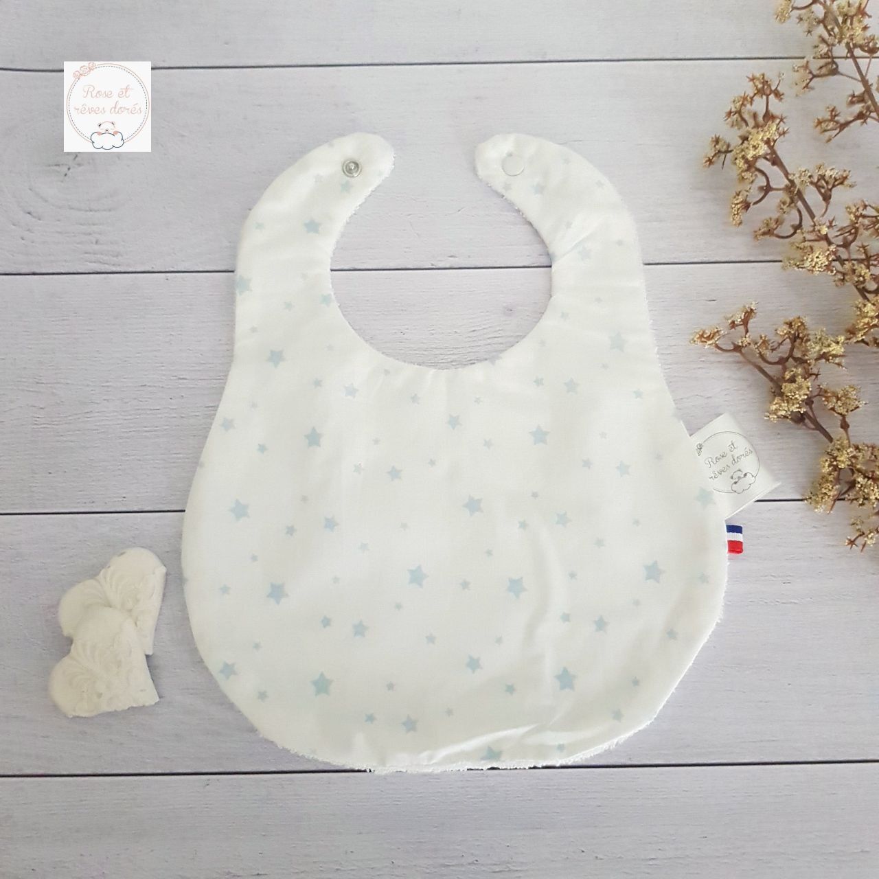 Les bavoirs bébé Rose et rêves dorés sont confectionnés par les soins de la créatrice de la marque, selon le savoir-faire artisanal, dans des matières certifiées sans substance nocives, dans son atelier parisien.