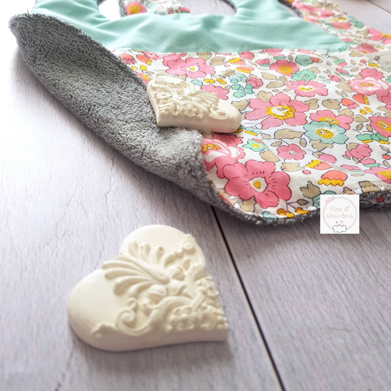 Les bavoirs bébé Rose et rêves dorés sont confectionnés par les soins de la créatrice de la marque, selon le savoir-faire artisanal, dans des matières certifiées sans substance nocives, dans son atelier parisien.