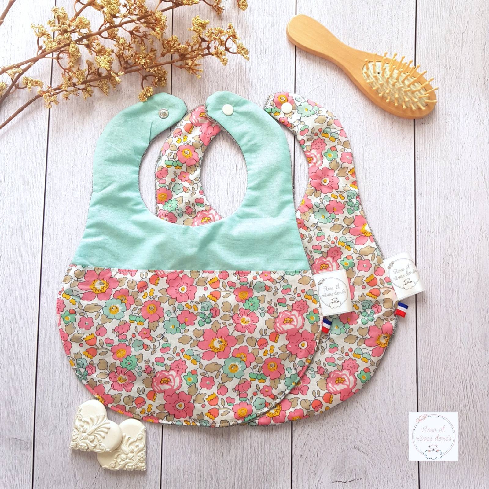 Le bavoir pour bébé, un accessoire indispensable, un classique des cadeaux à offrir à l’occasion de naissance ou d’un premier anniversaire. Il vous est proposé sous la forme d’un duo où le Liberty a la part belle.