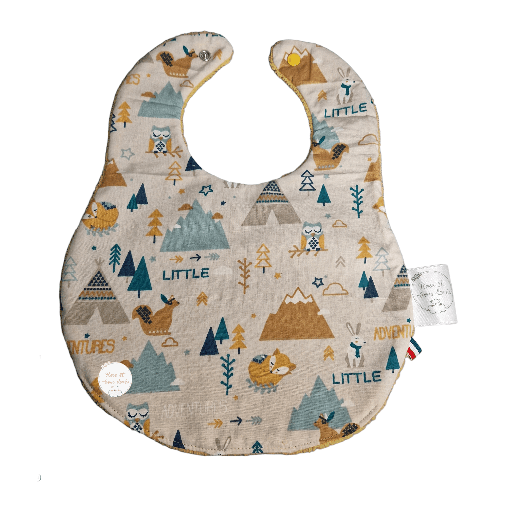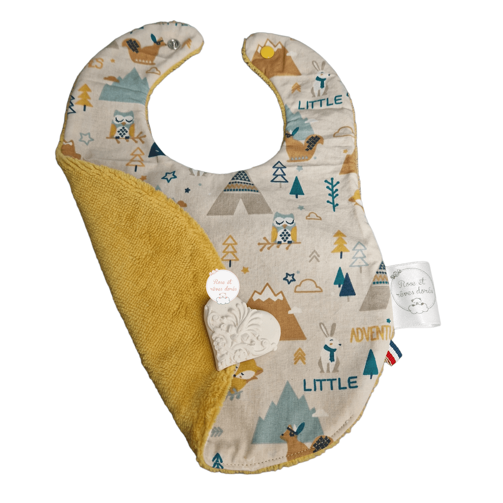 Les bavoirs bébé Rose et rêves dorés sont confectionnés par les soins de la créatrice de la marque, selon le savoir-faire artisanal, dans des matières certifiées sans substance nocives, dans son atelier parisien.