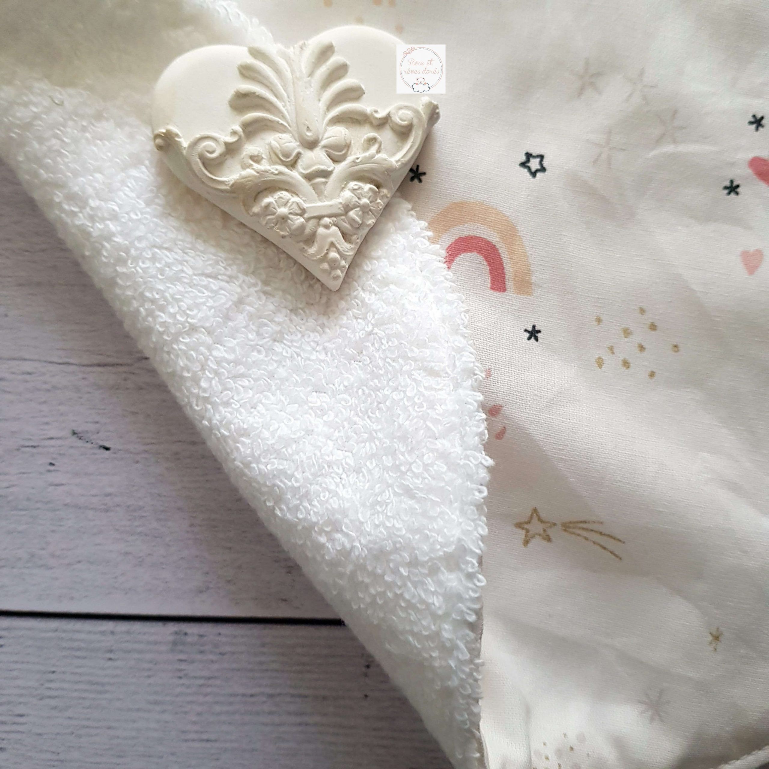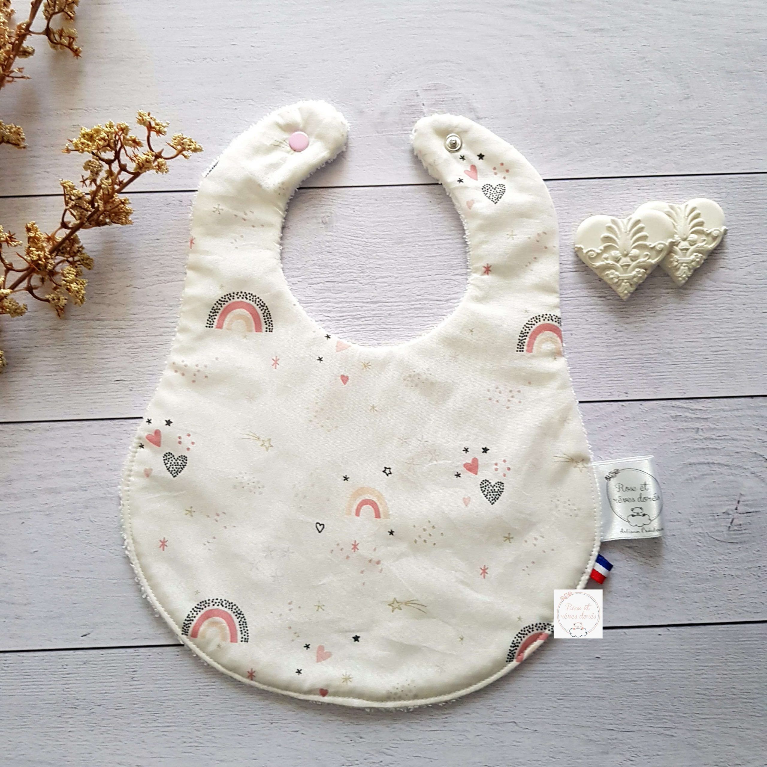 Les bavoirs bébé Rose et rêves dorés sont confectionnés par les soins de la créatrice de la marque, selon le savoir-faire artisanal, dans des matières certifiées sans substance nocives, dans son atelier parisien.