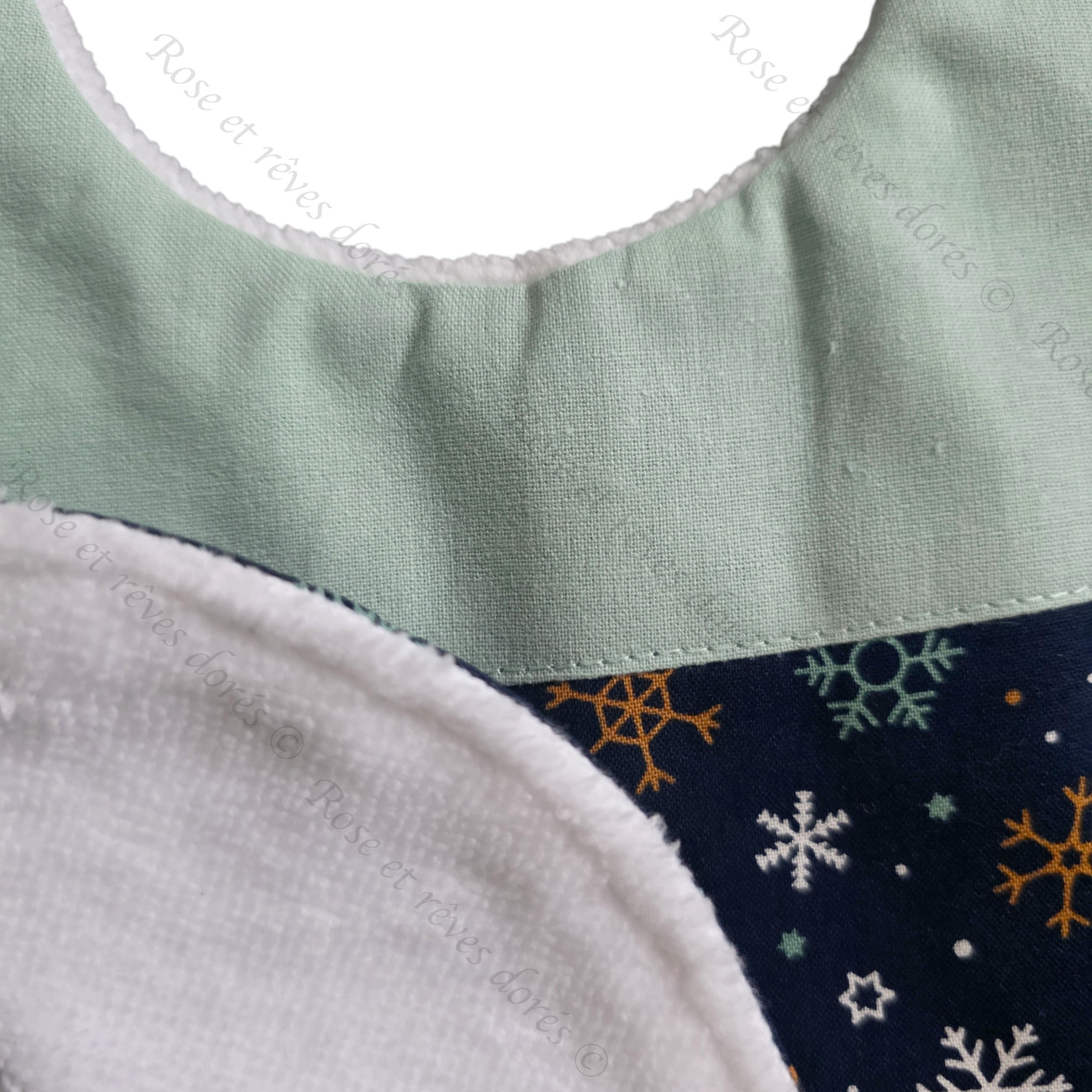 6. Coloris : coton mint et coton bleu marine à motifs de flocon de neige, éponge blanche.