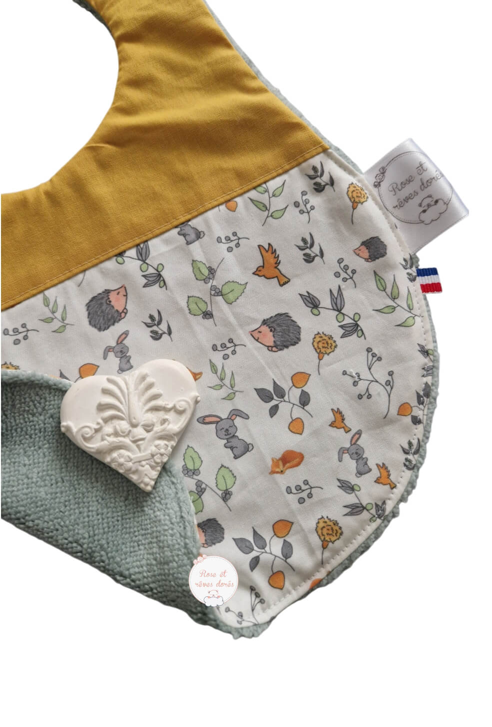 Ce bavoir fait partie de la ligne des Intemporels Exclusifs, une ligne d’accessoires ayant reçu le Label Fabriqué à Paris pour la promotion 2023 et qui comporte des articles aux tissus uniques dessinés par Rose et rêves dorés. Ici il s’agit du motif Jeanne, un motif dédié à la grand-mère de l’artisane.