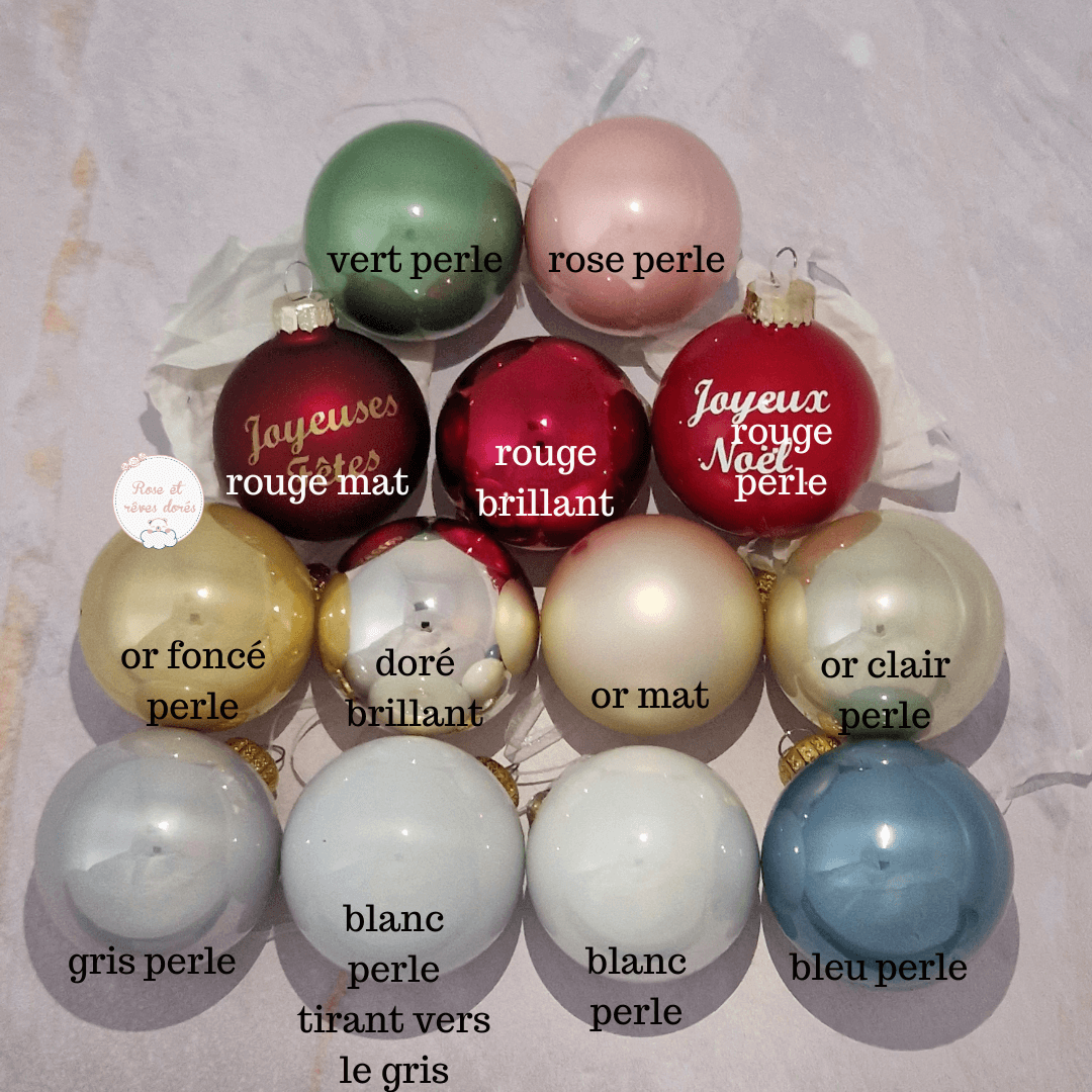 Plusieurs couleurs au choix pour les boules : gris perle, blanc perle tirant sur le gris clair, blanc perle, bleu perle, or foncé perle, doré brillant, or mat, or clair perle, rouge mat, rouge brillant, rouge perle, vert perle, rose perle.
