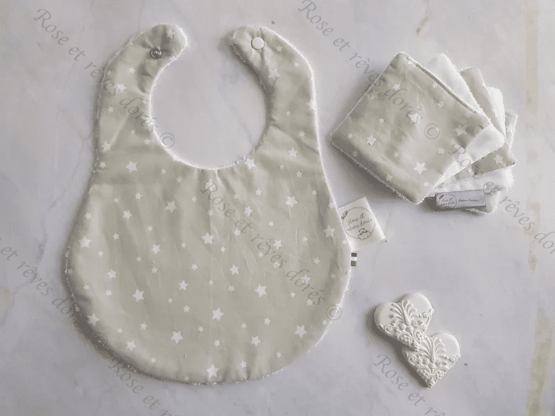- Design : Le bavoir et les lingettes possèdent une face en coton et une face en éponge de bambou, la base est surpiquée.