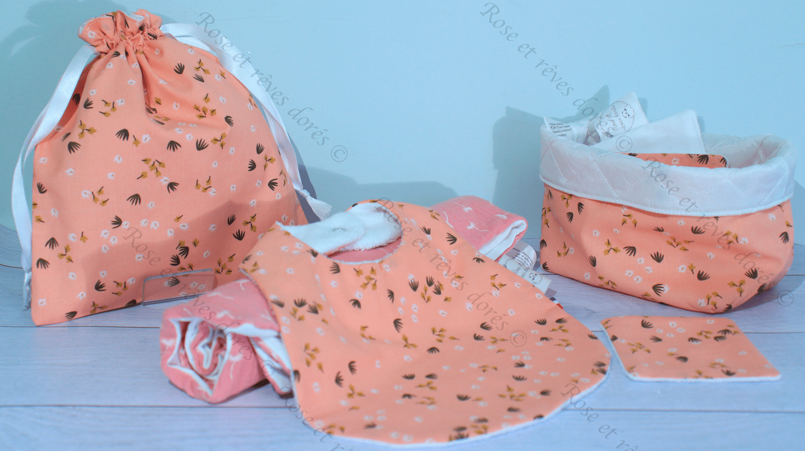 - Design : Le bavoir et les lingettes possèdent une face en coton et une face en éponge de bambou, la base est surpiquée. Le pochon et le lange sont entièrement confectionnés en coton. La panière est confectionnée avec une face en coton et une face en polyester matelassé.