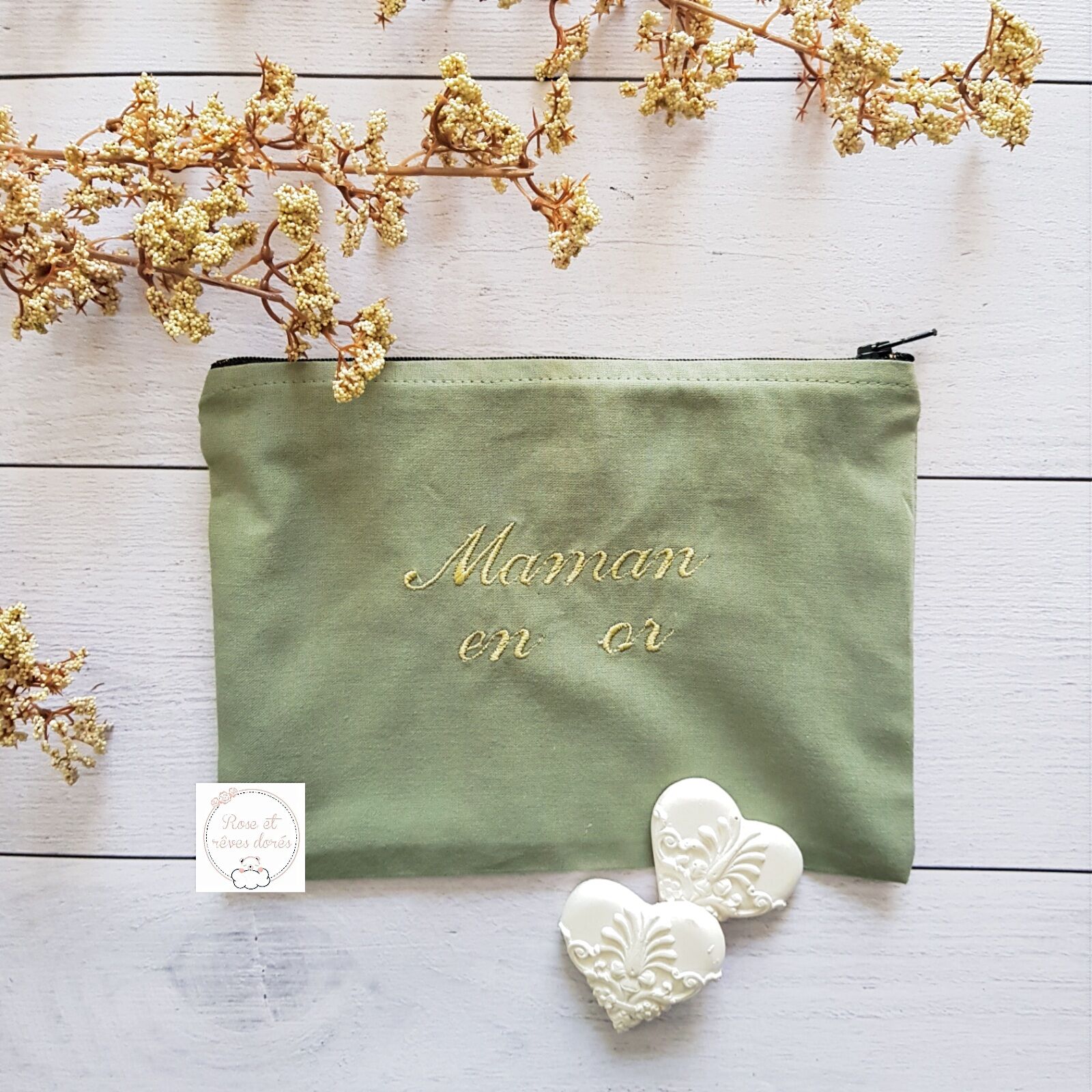 – une pochette en coton doublée avec un coton du même motif que le bavoir de bébé. Elle possède une broderie dorée avec un doux message pour les mamans.