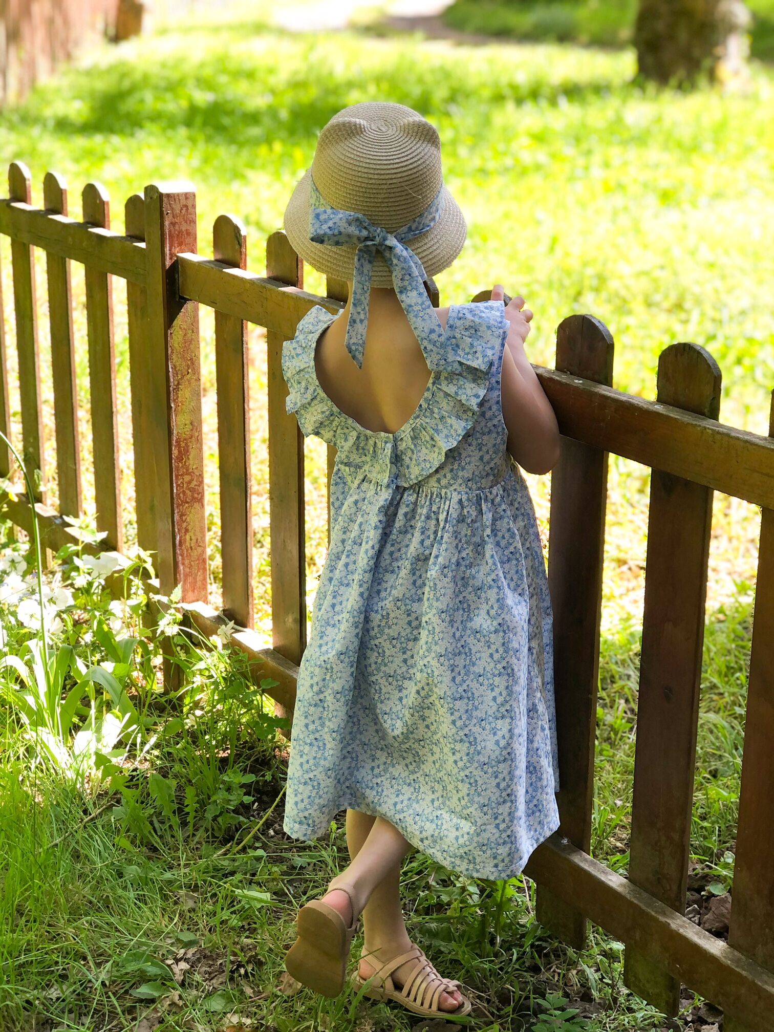 Laurence, la créatrice d’Alice & Charlotte, a confectionné spécialement pour l’occasion une ravissante robe. Cette robe sans manches est à encolure ronde possède un dos nu arrondi. Elle est ornée d’un volant sur toute l’encolure. La fermeture se fait dans le dos par des boutons de nacre. Elle est entièrement doublée (corps et jupon). La longueur se situe sous le genou, elle possède une belle ampleur, une jolie robe « qui tourne ». Son côté délicat et romantique en fait une robe convenant pour chaque jour ou pour des occasions plus formelles.