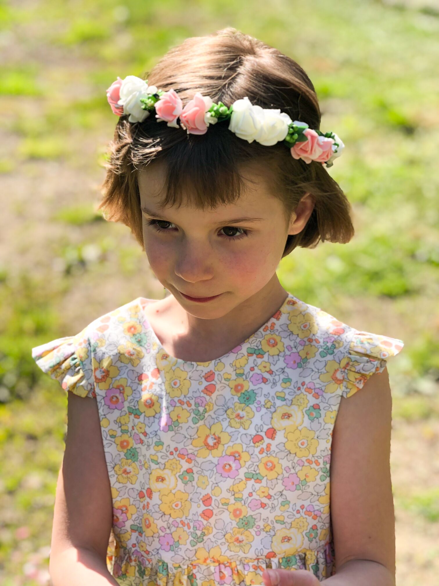 Laurence, la créatrice d’Alice & Charlotte, a confectionné spécialement pour l’occasion une ravissante robe. Cette robe sans manches est à encolure ronde devant avec un dos nu arrondi. Elle possède des mancherons volantés. La fermeture se fait dans le dos par des boutons de nacre. Elle est entièrement doublée (corps et jupon). La longueur se situe sous le genou. Son côté délicat et romantique en fait une robe convenant pour chaque jour ou pour des occasions plus formelles.