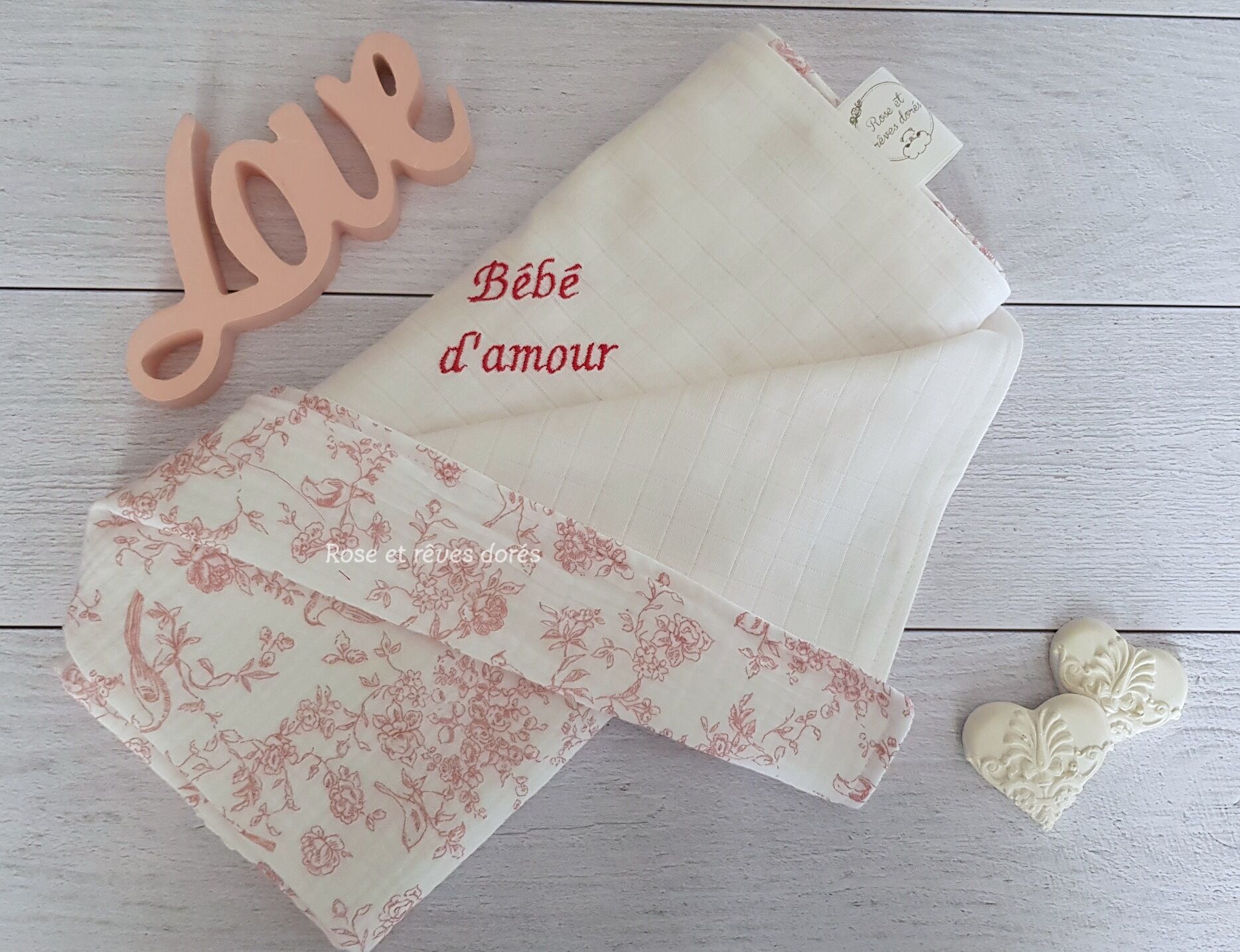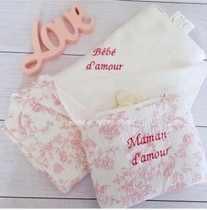 Un duo prêt à être adopté par une future maman ou une jeune maman. Il est composé de deux articles qui deviendront vite indispensables. Vous trouverez dans ce duo une pochette ouatinée pour maman et un lange double face pour bébé tous deux confectionnés en double gaze et coton tetra. Ces deux articles sont brodés avec le message « Bébé d’amour » et « Maman d’amour ».