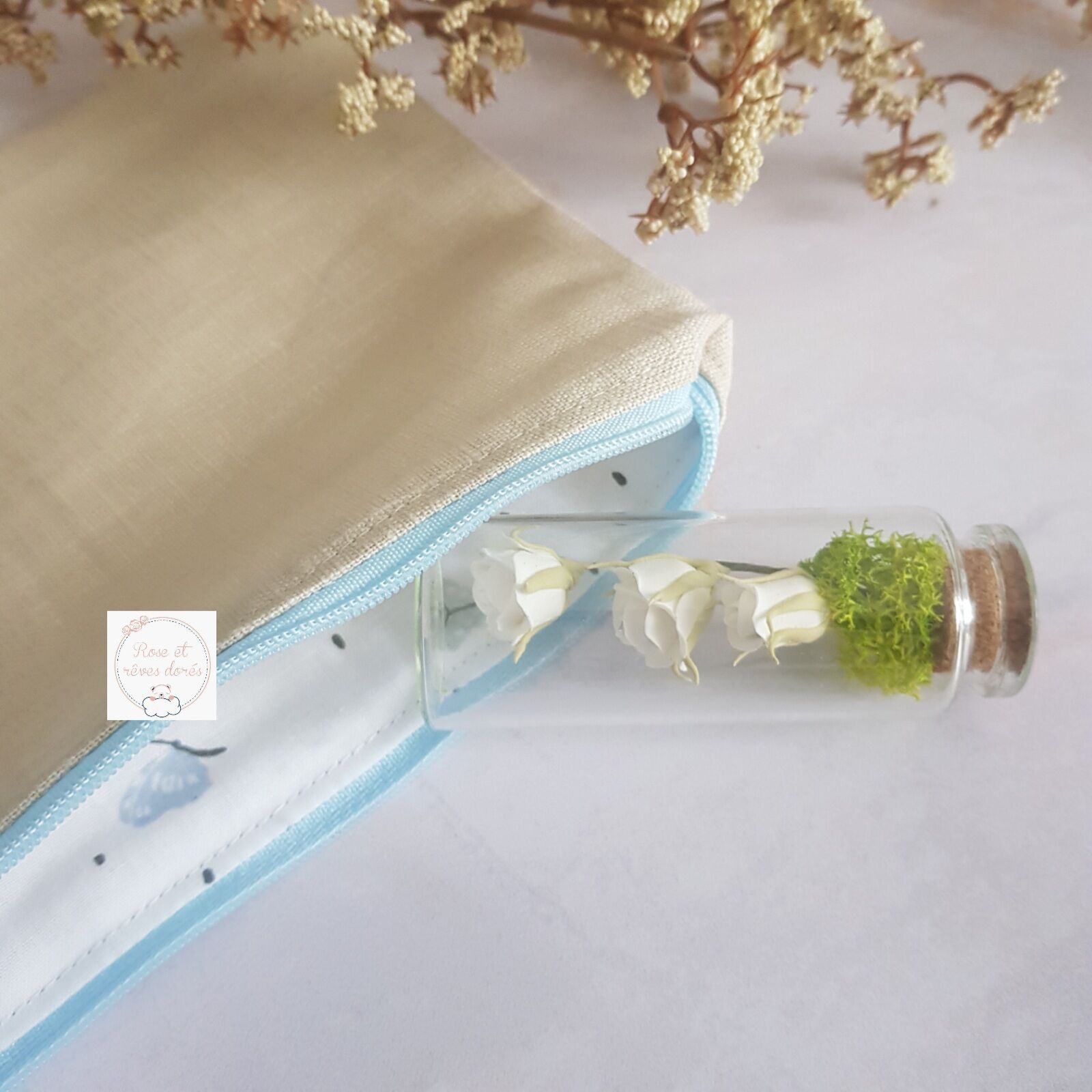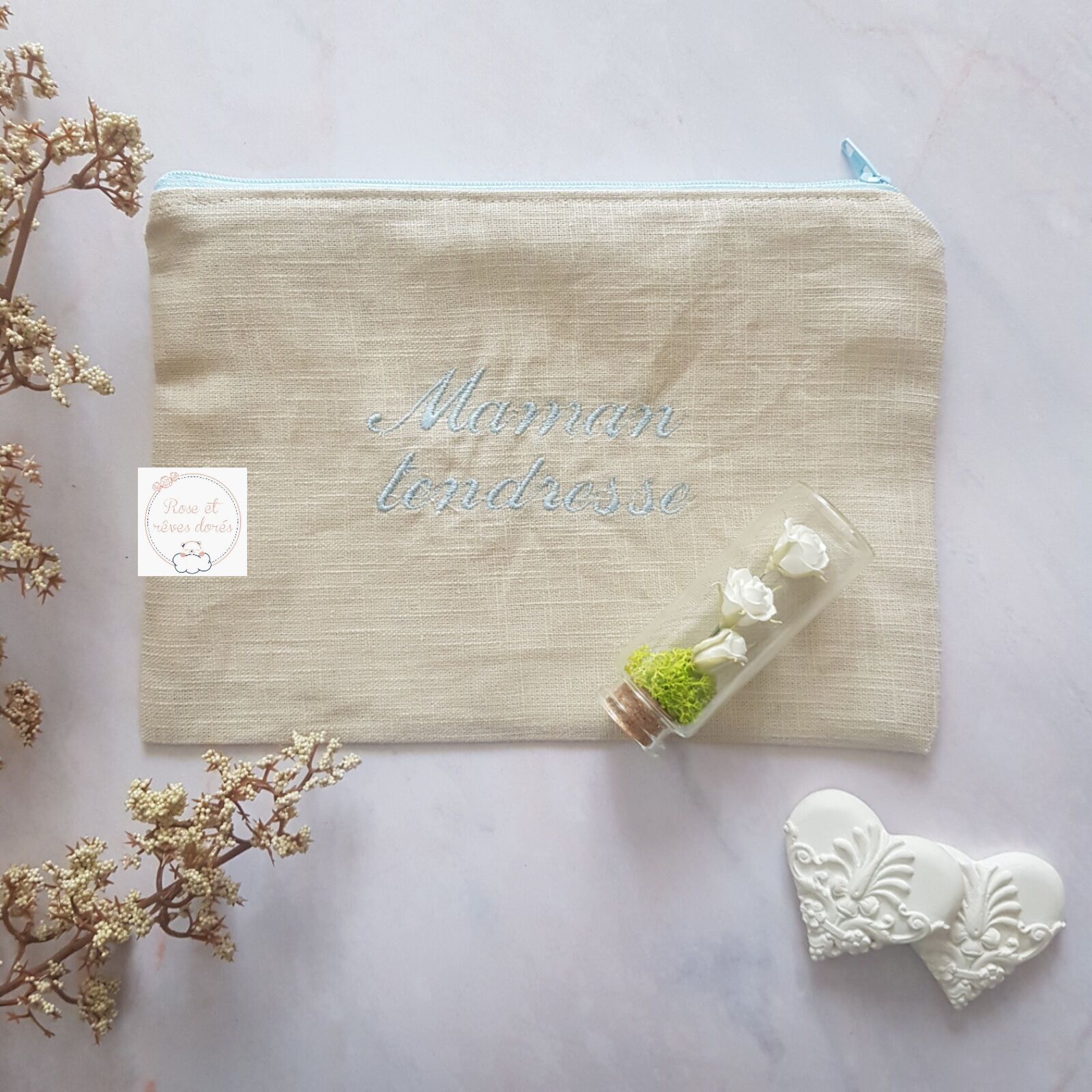 La pochette en lin doublée avec du coton est idéale pour accueillir les petites affaires de maman. Que ranger dans une pochette ? Du maquillage, des clés, des médicaments, des papiers importants… chaque maman a ses habitudes. La pochette possède une broderie bleu ciel avec un doux message pour les mamans.