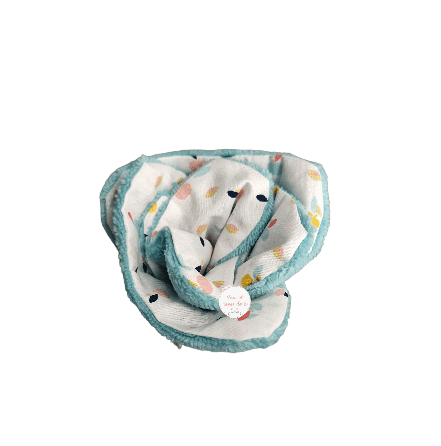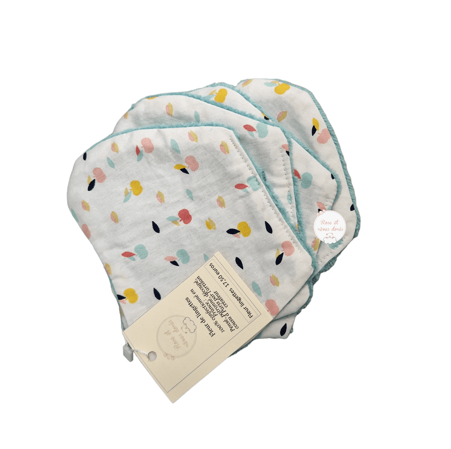 Rose et rêves dorés vous propose un lot de 4 lingettes disposées en forme de fleur aux motifs  de pommes. Ces lingettes au format unique, de grande dimension, ont toutes une face en coton et une face en éponge bambou bleu. Les fleurs de lingettes appartiennent à la gamme l’Intemporel grâce à leur forme iconique reprenant les roses du logo.