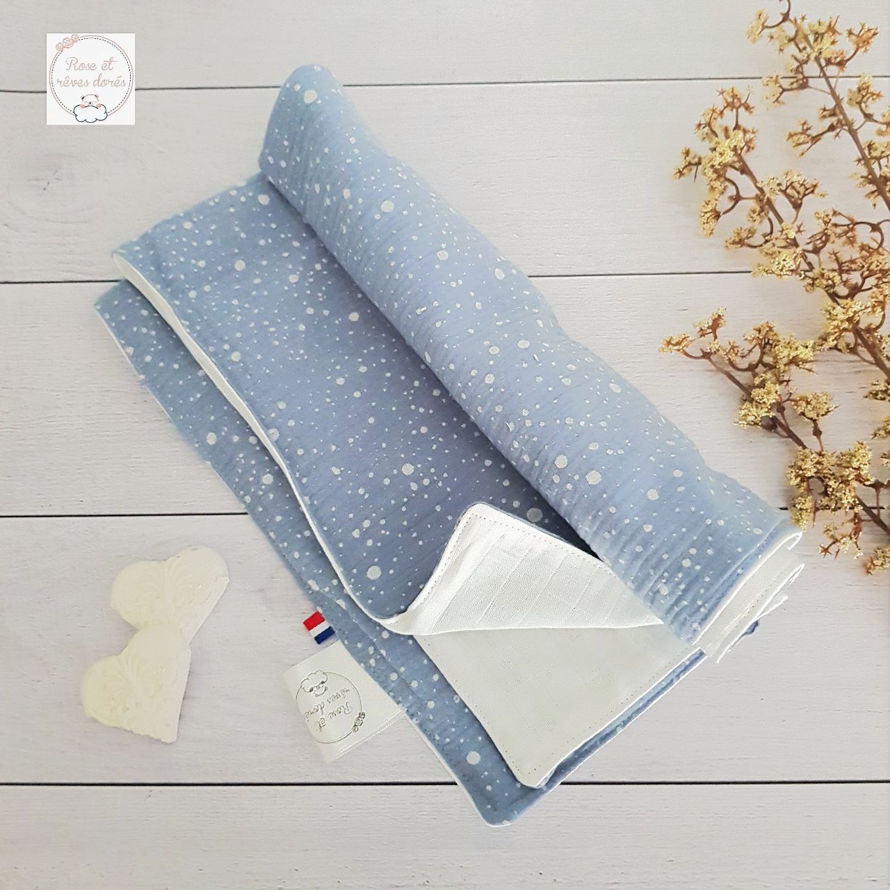 Le lange pour bébé est confectionné dans des matières certifiées sans substances nocives. Il est confectionné en France, dans l’atelier parisien de Rose et rêves dorés, par ses soins, de façon artisanale.
