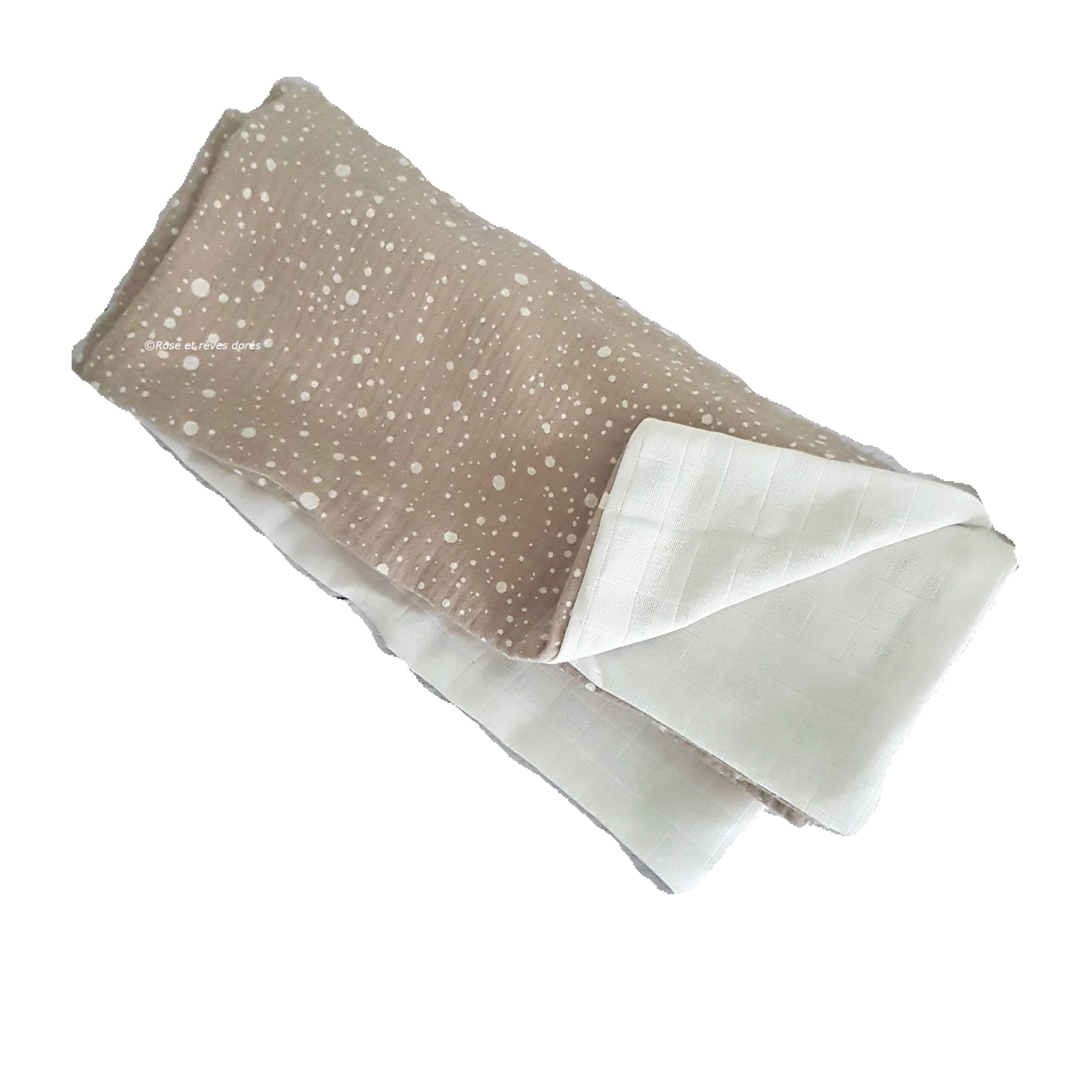 Rose et rêves dorés vous propose ici un lange double-face. Un côté en coton double gaze à motif et un côté en coton tétra blanc, pour multiplier les occasions de l’utiliser et changer de style selon les envies, les tenues de bébé, l’occasion …