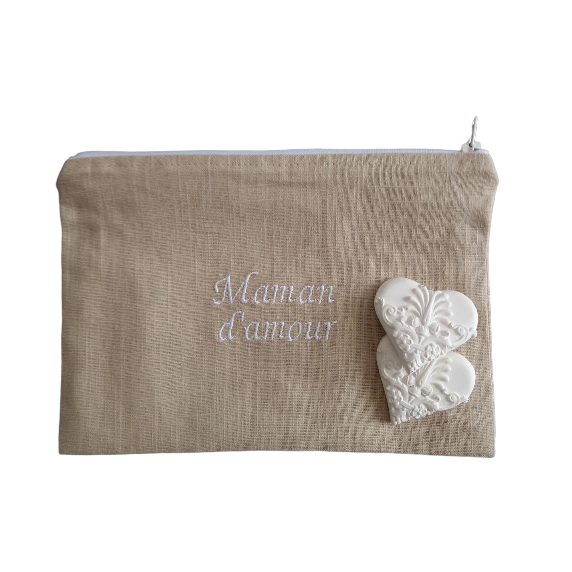 Une pochette brodée au doux texte « Maman d’amour », en lin, doublée de coton à motif étoiles, prête à devenir votre compagne idéale, pour ranger vos petites affaires et les avoir facilement sous la main.
