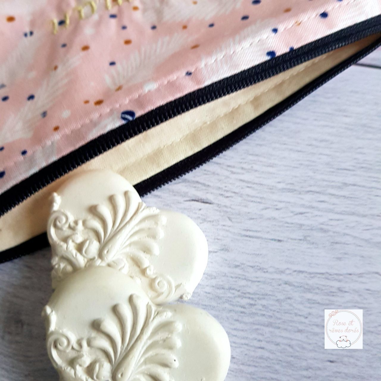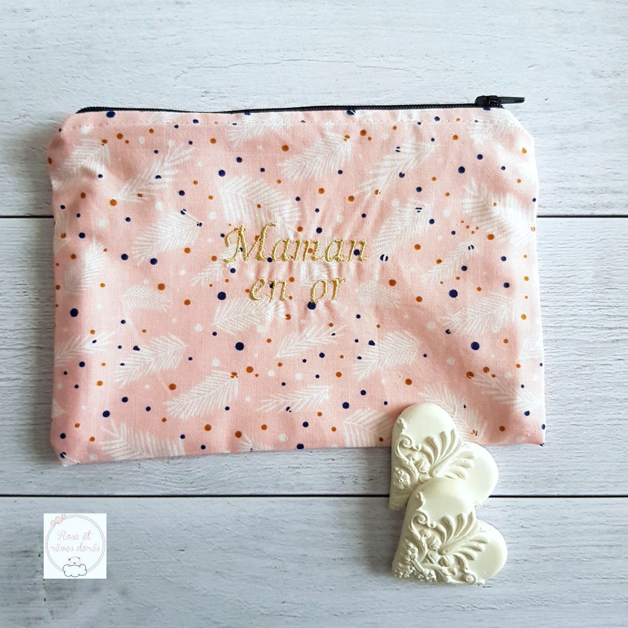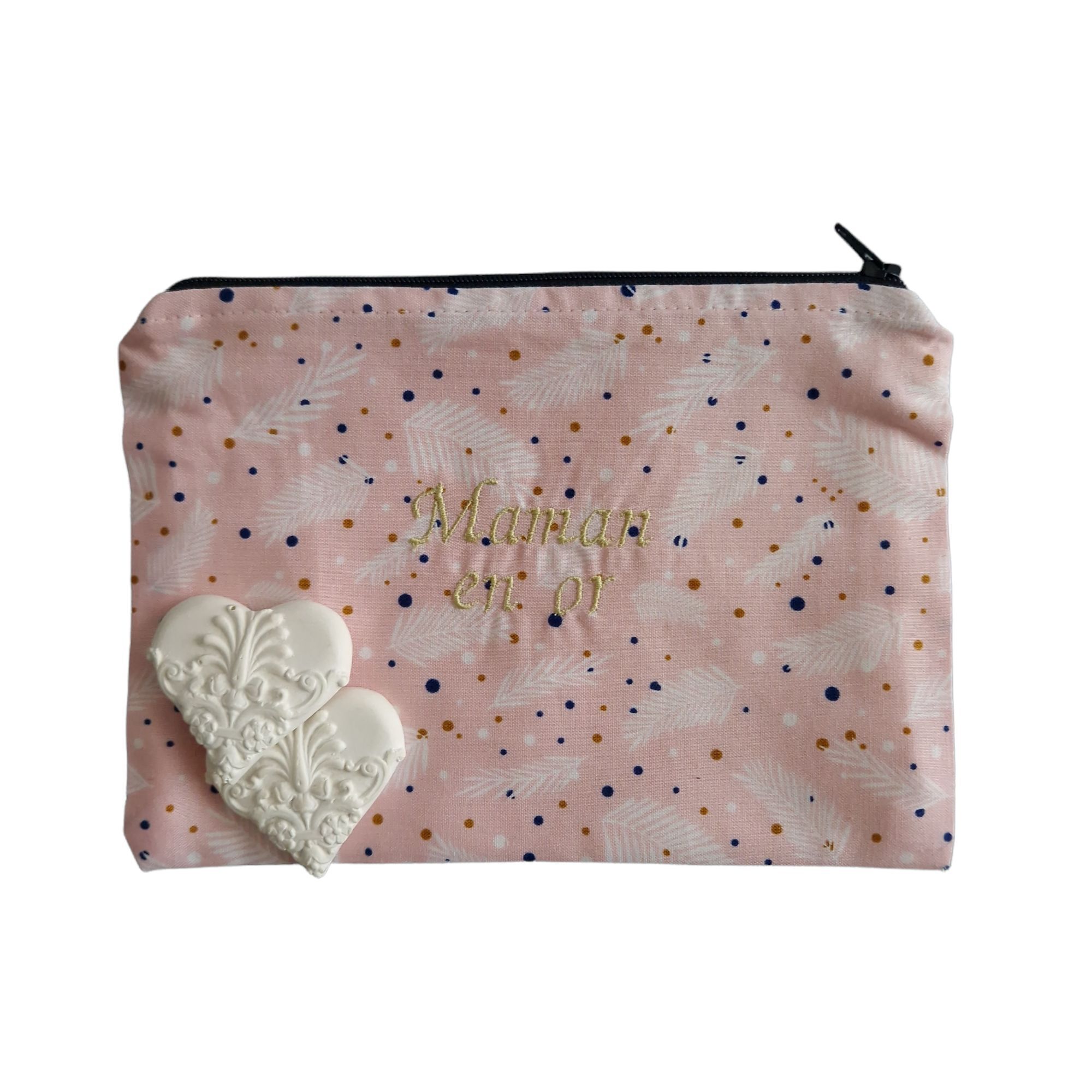 Une pochette brodée au doux texte « Maman en or », en coton rose à motif, doublée de coton crème, prête à devenir votre compagne idéale, pour ranger vos petites affaires et les avoir facilement sous la main.