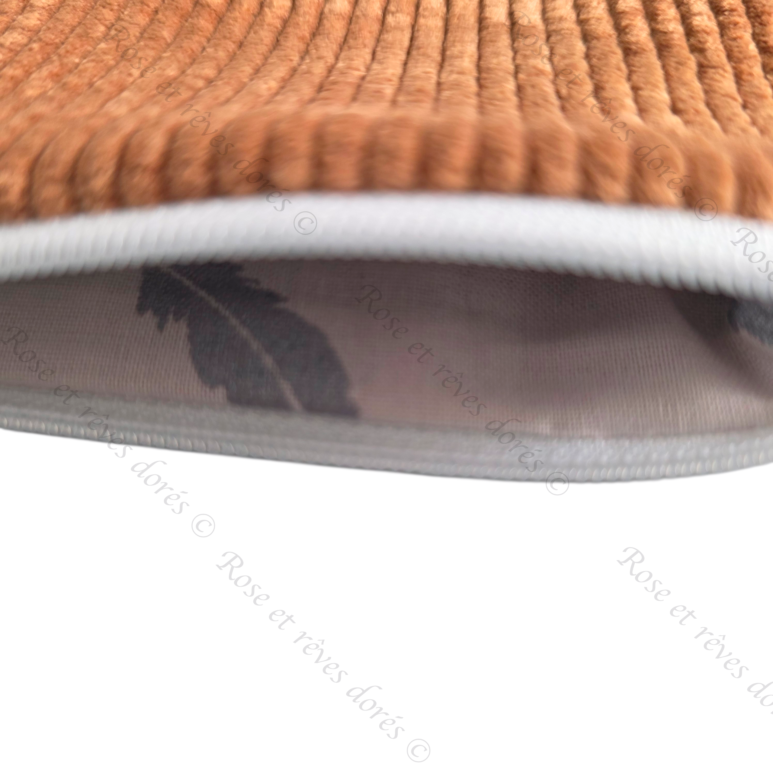 - Coloris : velours camel et coton gris à motifs plumes argentées.
