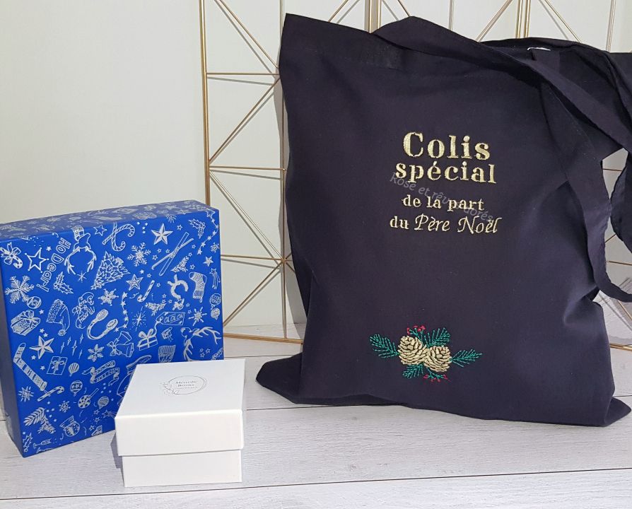 Il s’agit d’un tote bag simple orné d’une broderie sur le thème de Noël. Vous avez la possibilité de faire ajouter la mention « Pour » suivie d’un prénom ou surnom dans la couleur de votre choix.