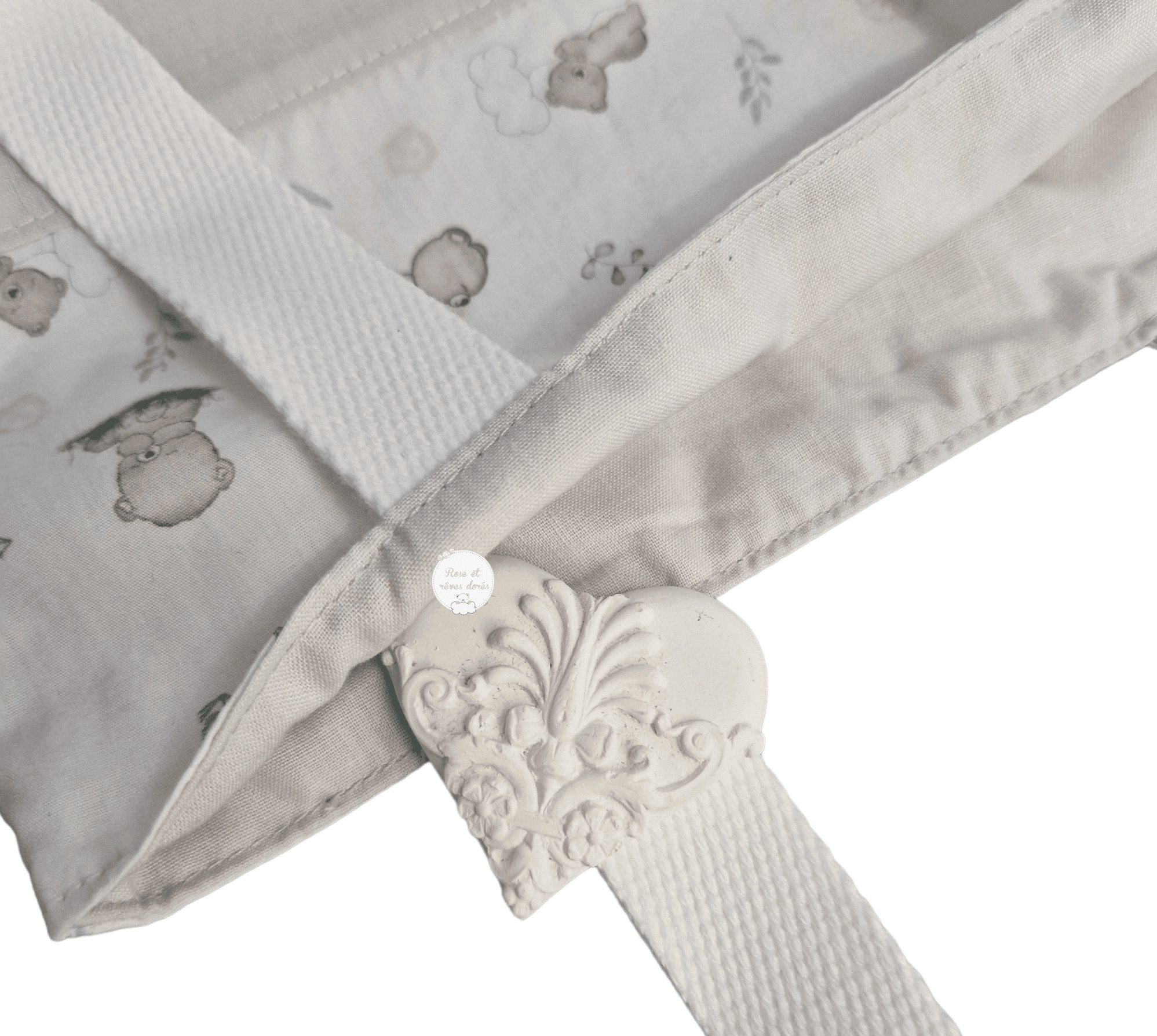 Composition : 100% coton : coton crème à motifs exclusif oursons, nuages, feuillages, roses, coton grège pour la partie basse et pour la doublure, sangles coton blanc.